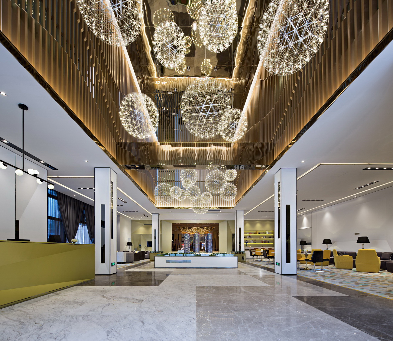 本案布局主要分為上下兩層,一樓為前臺(tái)接待區(qū)、模型區(qū)、洽談區(qū)、吧臺(tái)、VIP室及辦公室;二樓則包括VIP洽談室及銀行簽約區(qū)。